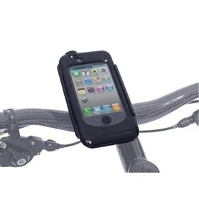 The BioLogic Bike Mount for iPhone 4 lets you attach your iPhone 4 to the handlebar of your bike so you can use GPS and an appropriate app to track your position, your speed, or distance travelled, while you ride. The Bike Mount is a weatherproof case with a welded touch sensitive membrane so your iPhone is completely protected from the weather but still fully functional. The inside of the case is lined with silicone for shock resistance.